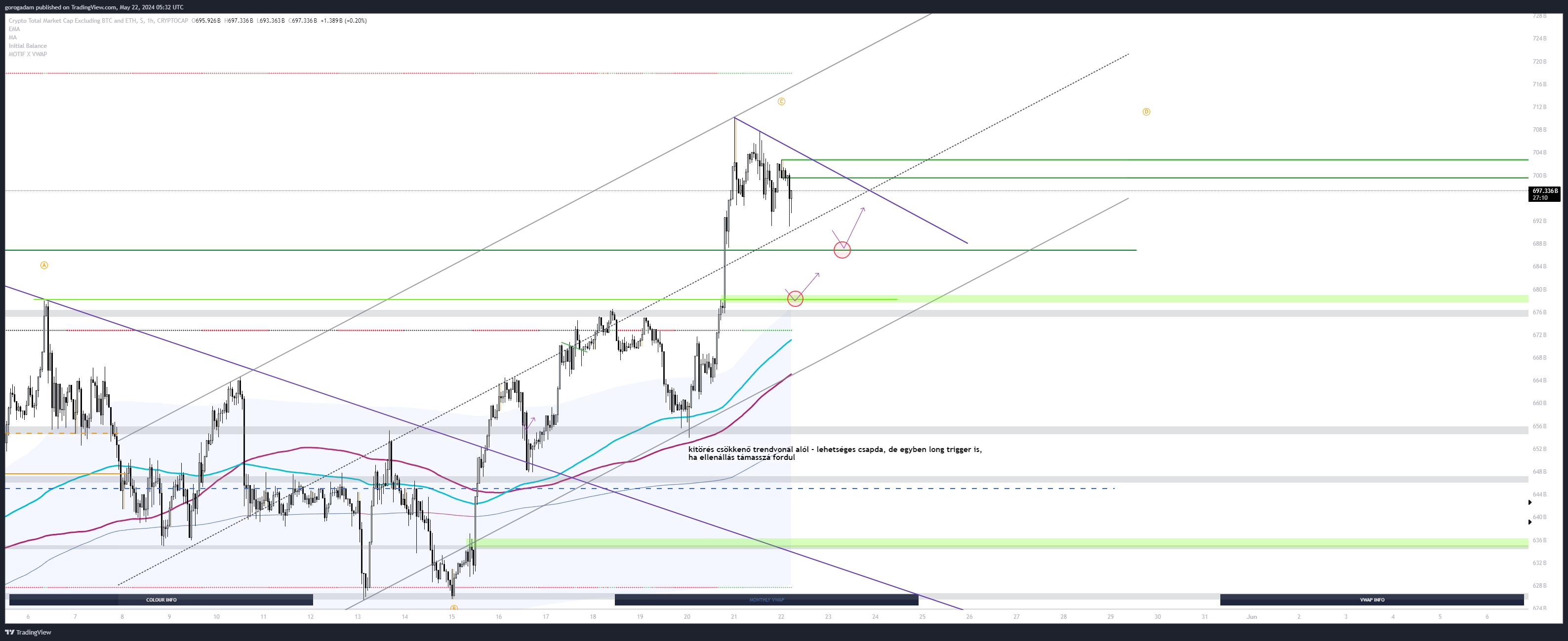 TOTAL3 legutóbbi kereskedési trigger: én arra számítok, hogy kapunk egy konszolidációt a lila vonal és 687B (sötétzöld vonal) között.
