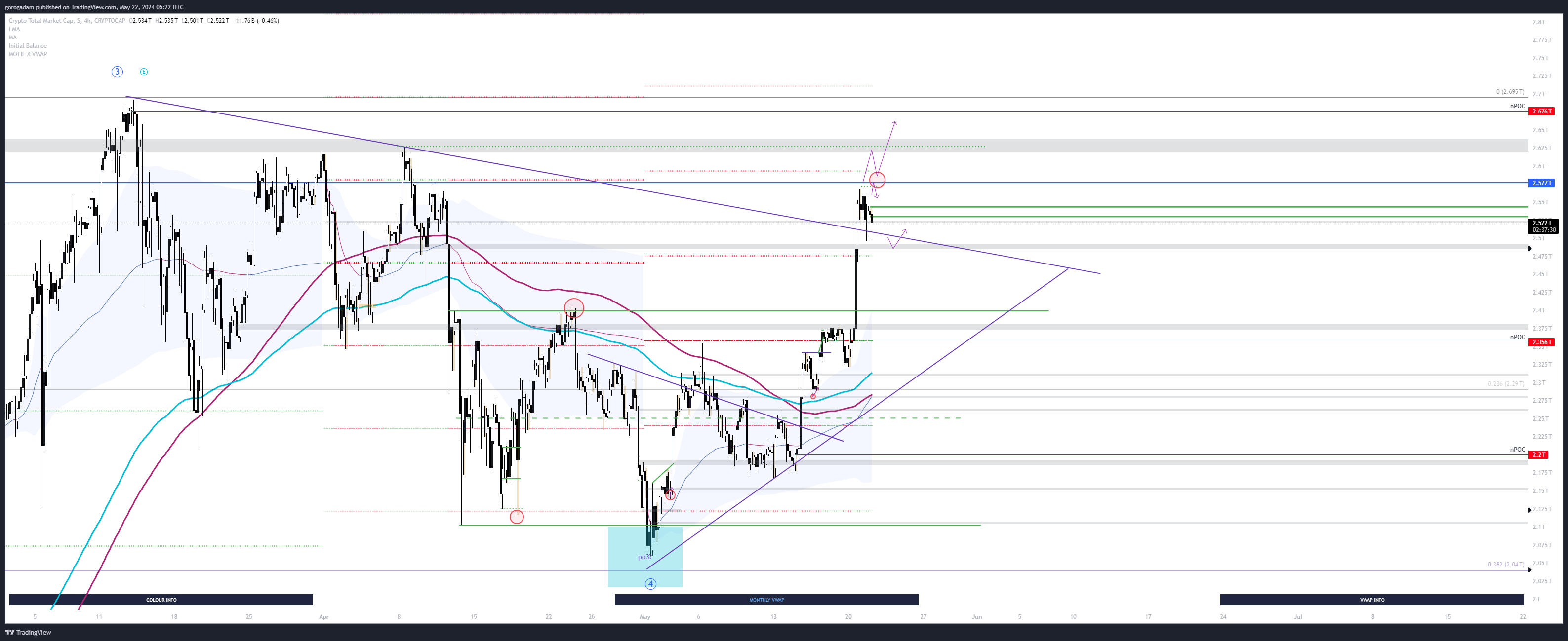 Shortolni semmiképp sem érdemes, egy szint van, aminek a visszatesztje érdekes, a 2.477T (előző havi VWAP bandszéle), ami közel van egy 4 órás aljhoz, itt lehet némi likviditás és logikus retest is – ha ide lejutunk, akkor ott új vásárlók lépnek majd be.