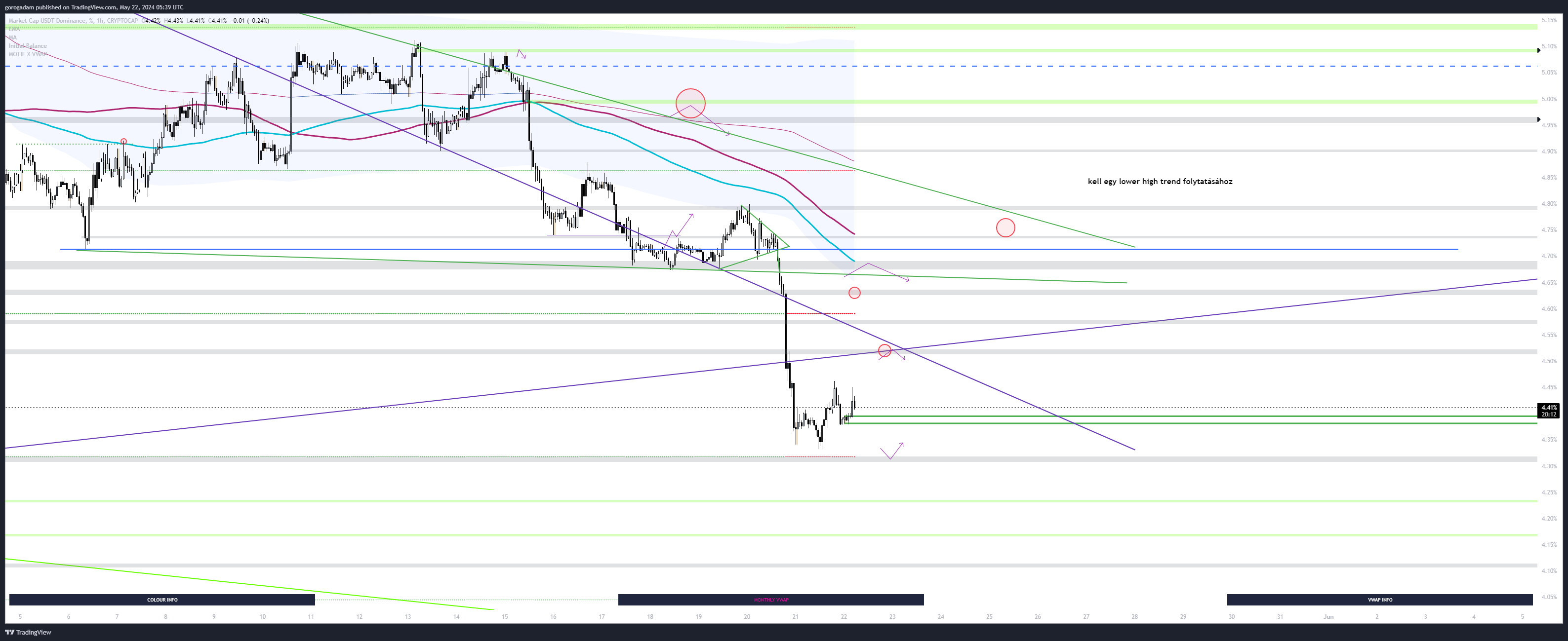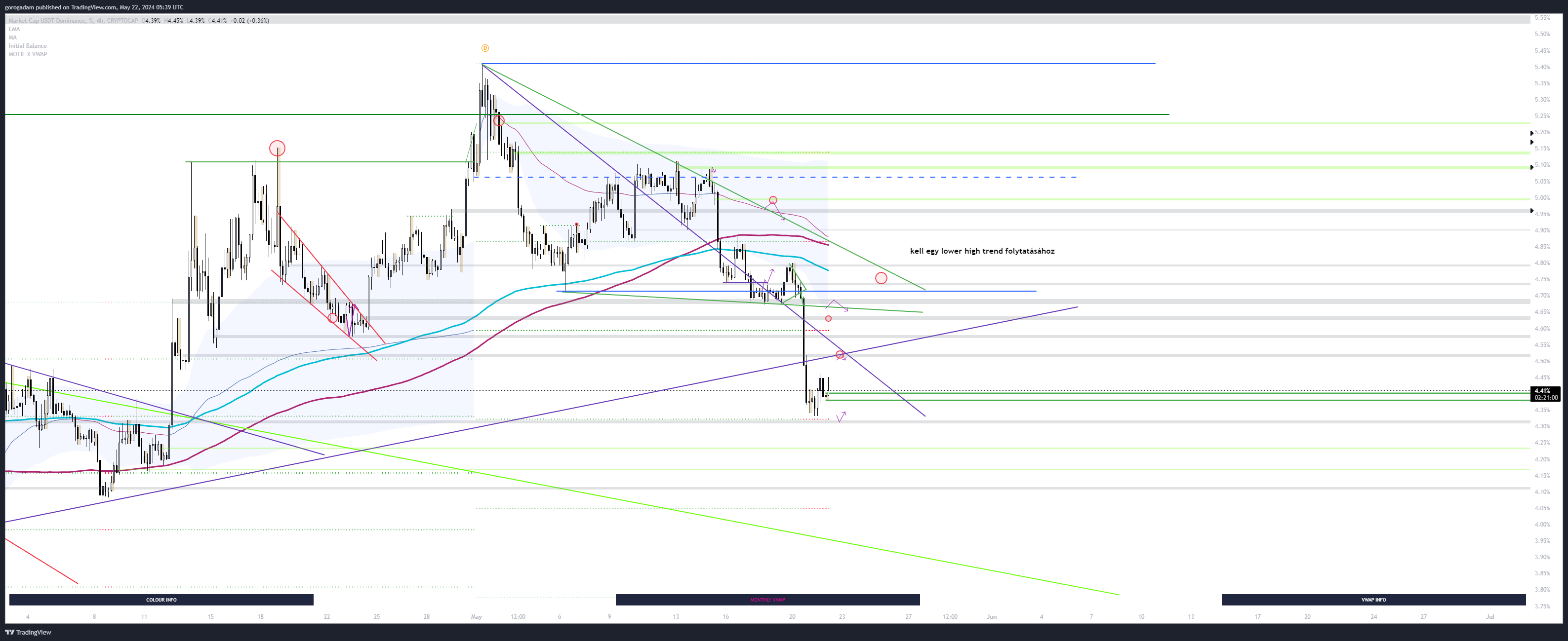USDT.d legutóbbi kereskedési trigger: az USDT.d-n látszik egy szint, aminek a visszatesztelése valószínű, és úgy néz ki érdemes ezzel időzíteni – a a 4.52%-os szint, a korábbi lila vonal medvés visszatesztje lehet érdekes, én ezt tervezem kivárni.